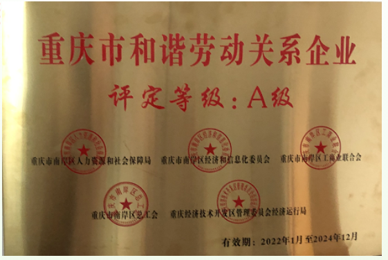 近日,重慶創(chuàng)迪科技榮獲由重慶市人力資源和社會保障局、重慶市南岸區(qū)經(jīng)濟和信息化委員會、重慶市南岸區(qū)工商業(yè)聯(lián)合會、重慶市南岸區(qū)總工會、重慶經(jīng)濟技術開發(fā)區(qū)管理委員會經(jīng)濟運行局共同頒發(fā)的2022年度“重慶市和諧勞動關系企業(yè)A級”稱號。