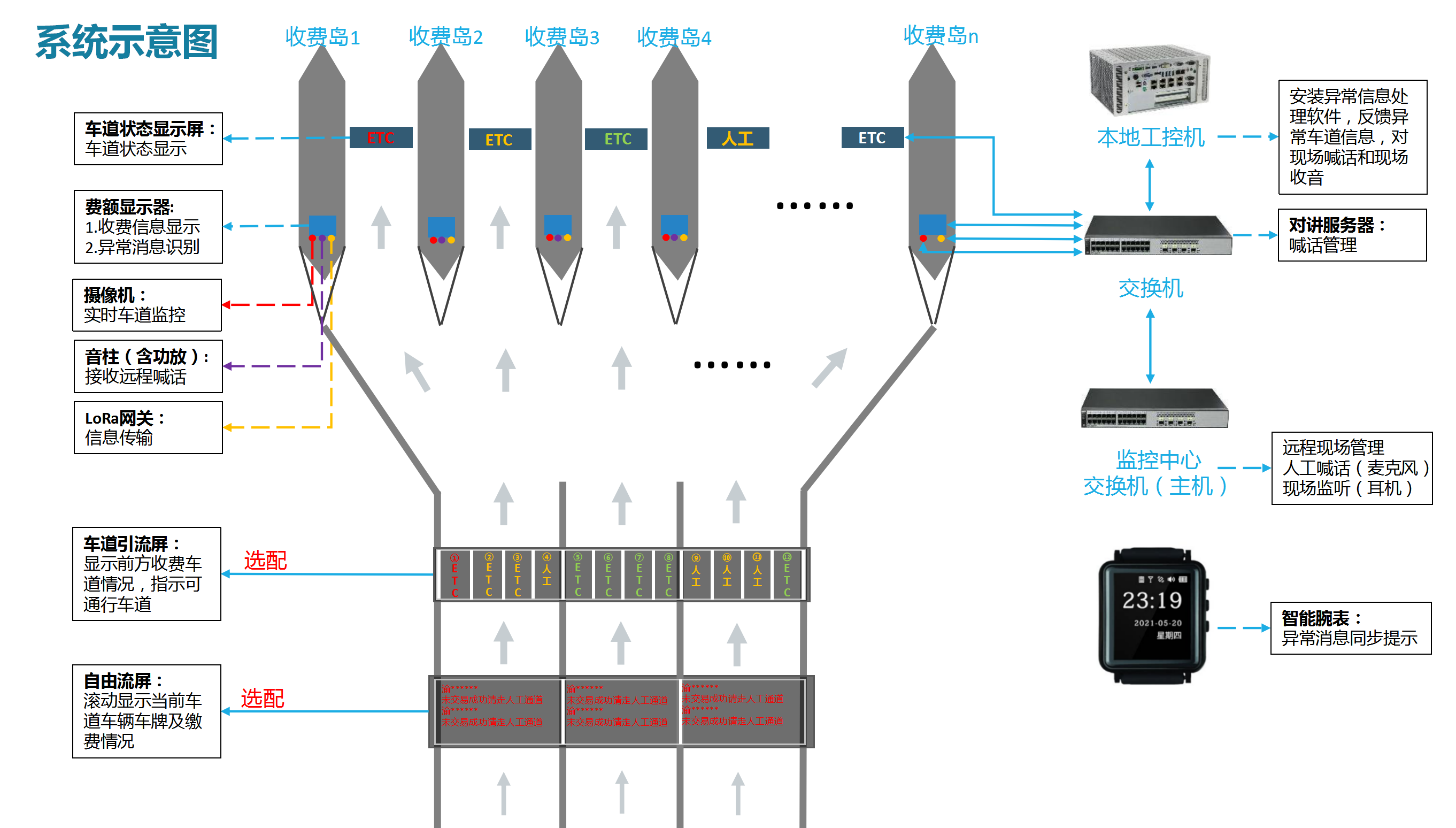該系統(tǒng)由費(fèi)額顯示系統(tǒng)、語音提示系統(tǒng)、無線通信系統(tǒng)、車道狀態(tài)屏、車道引流屏共同組成。系統(tǒng)還配置了專門的軟件管理平臺(tái),可對(duì)每一條收費(fèi)車道進(jìn)行實(shí)時(shí)監(jiān)控,管理人員無需到場即可通過“遠(yuǎn)程喊話”的形式處理特情。系統(tǒng)還可集成自由流屏和車道引流屏,一同助力打造暢行的高速公路收費(fèi)站。